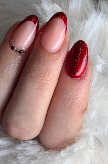 You can go with different designs on different nails with a combination of red glitter and white nail paint. Nail arts of stripes, French tips, etc. look really cool. Attaching rhinestones just above cuticles of some nails or on the French tip of a few can change the game.