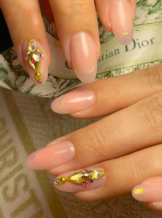 Wow! If you ask me about my personal favourite almond French tips with rhinestones design, this is it. It’s unique, subtle yet one of the most gorgeous designs. Try keeping the base of the nail subtle with colors. You can go for light pink, peach, and other pastels colors.
