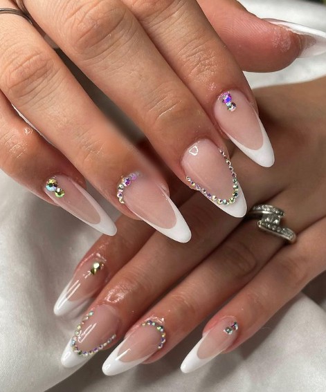 Line the rhinestones around the cuticles so that it deviates the attention from the centre making it look minimal. These French almond nails go along with all kinds of outfits and occasions.