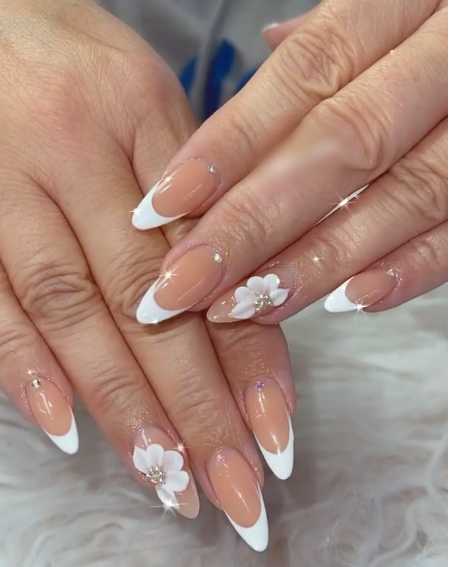 All you need to do is get French tips on your almond nails. Choose one middle nail in both hands and get rhinestones placed in the shape of a flower. You can also design leaves, stems or anything that you like with nail art around the rhinestone flower. Voila, it’s done.