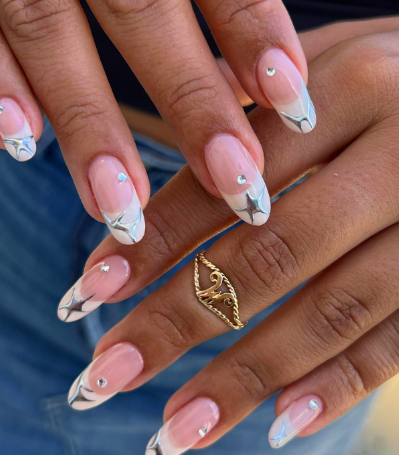 Without further ado, let’s check out some of the awesome almond French tips with rhinestones that will get you on the nail game.