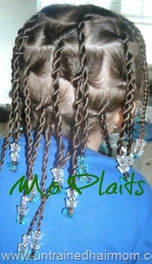 Mo Plaits is back with this cute natural hairstyle consisting of medium sized boxes with two strand rope twists and beads for added flair.
